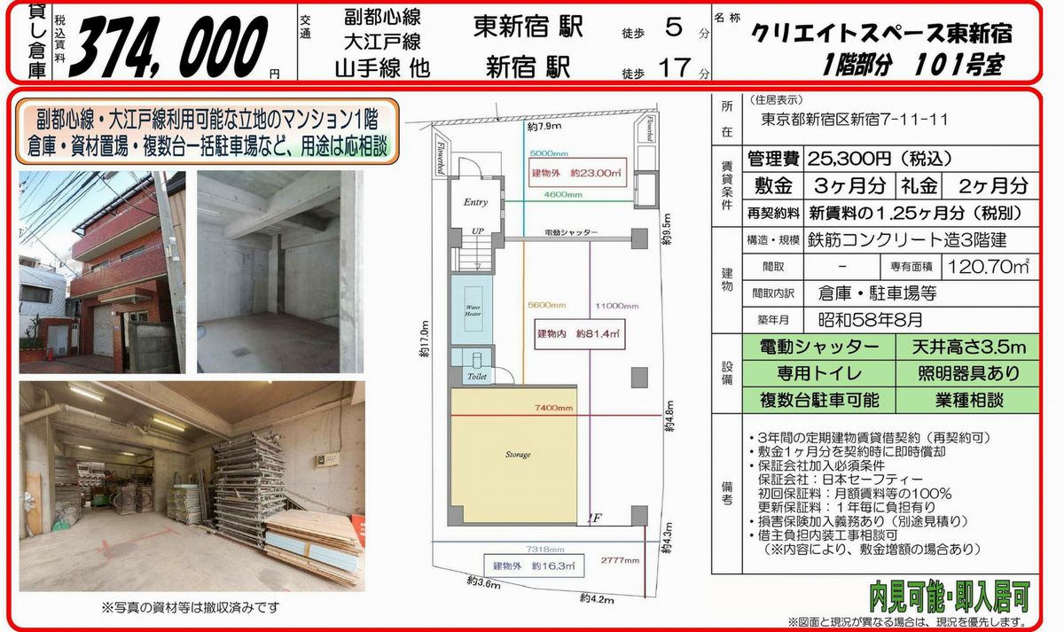 東京都内の貸し倉庫・貸し工場の情報満載(トップ) > 東京のエリアで探す > 東京都新宿区 > 東新宿 > 新宿区新宿7-11-11 クリエイトスペース東新宿