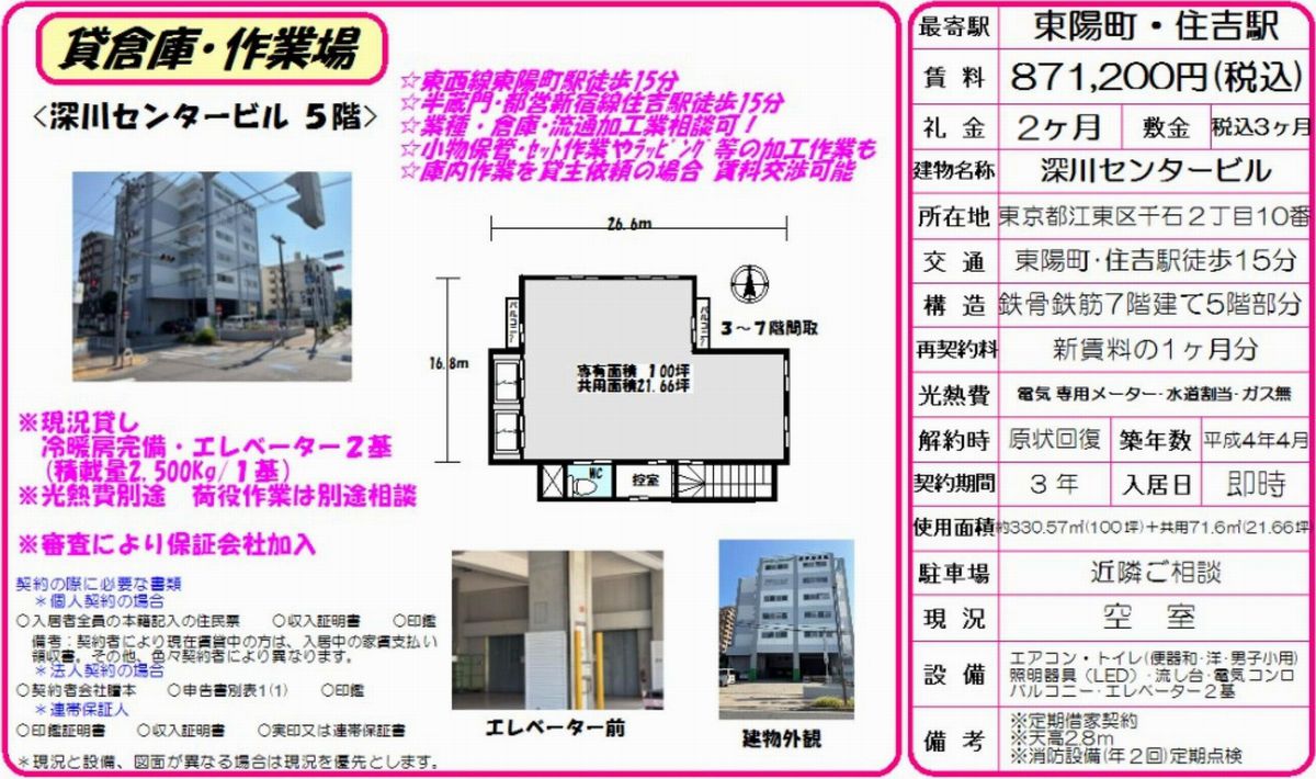 東京都内の貸し倉庫・貸し工場の情報満載(トップ) > 東京のエリアで探す > 東京都江東区 > 東陽町 > 江東区千石2-10 深川センタービル