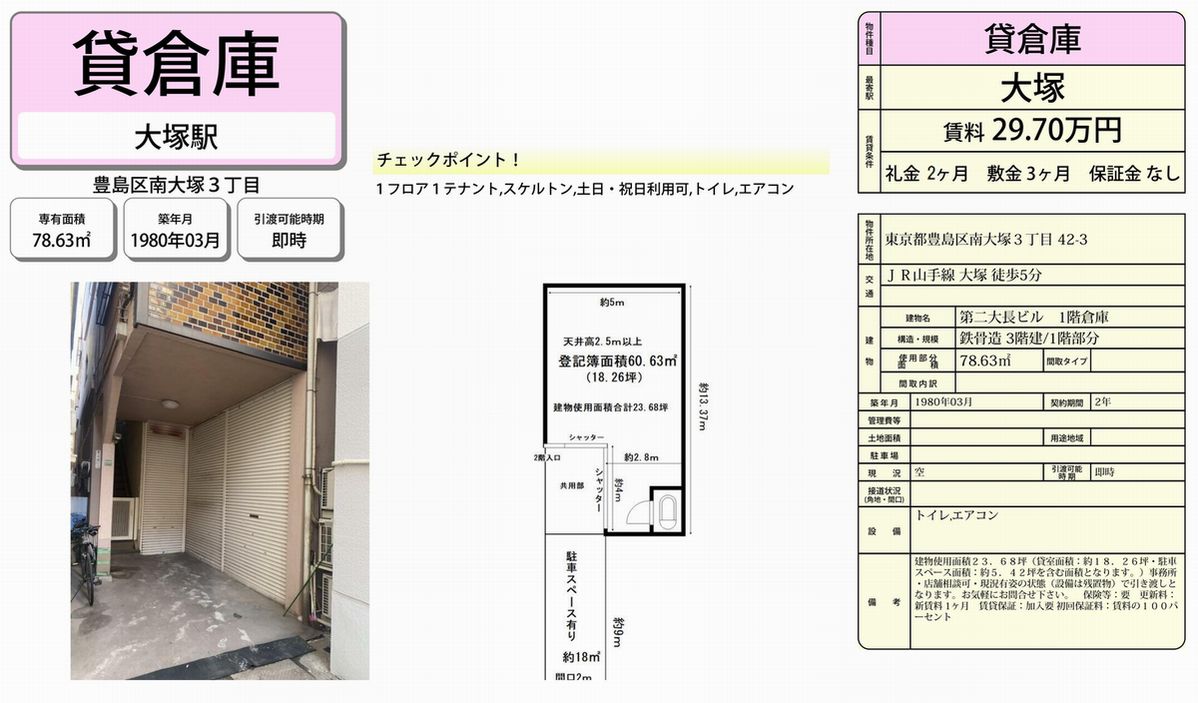 豊島区南大塚3-42-3(東京都)の貸し倉庫・貸し工場をはじめ東京全域の貸し倉庫・貸し工場を検索できます。豊島区南大塚3-42-3(東京都)の事務所付貸倉庫、クレーン付工場、店舗倉庫、工業専用地域等、ニーズに合わせて簡単検索。豊島区南大塚3-42-3(東京都)の貸し倉庫・貸し工場を貸したい方にはオーナーサポートシステムで無料にて査定・掲載いたします。豊島区南大塚3-42-3(東京都)で貸し倉庫・貸し工場をご契約のテナント様には貸し倉庫・貸し工場の設計変更、造作のご相談・施工も承ります。貸し倉庫・貸し工場で移転・新規開設をするなら東京地区最大級のテナント.com! |