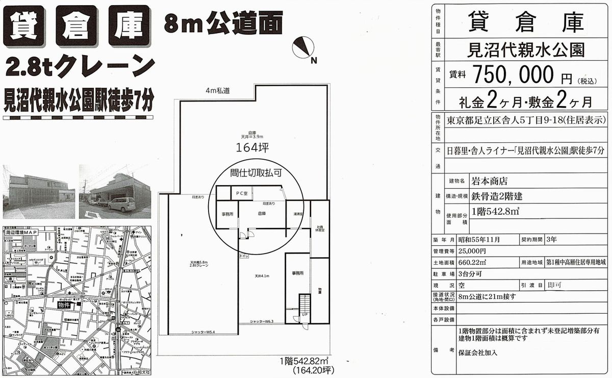 東京都内の貸し倉庫・貸し工場の情報満載(トップ) > 東京のエリアで探す > 東京都足立区 > 見沼代親水公園 > 足立区舎人5-9-18 岩本商店