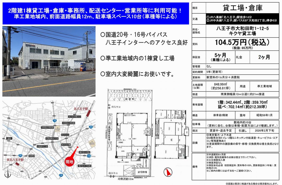 東京都八王子市大和田町1-12-5 (八王子) キクヤ貸工場 詳細データ