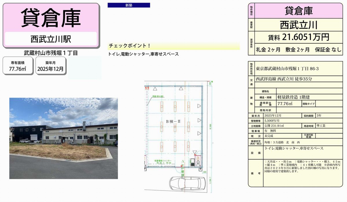 東京都武蔵村山市残堀1-86-3 (西武立川) 西武立川 貸倉庫 詳細データ
