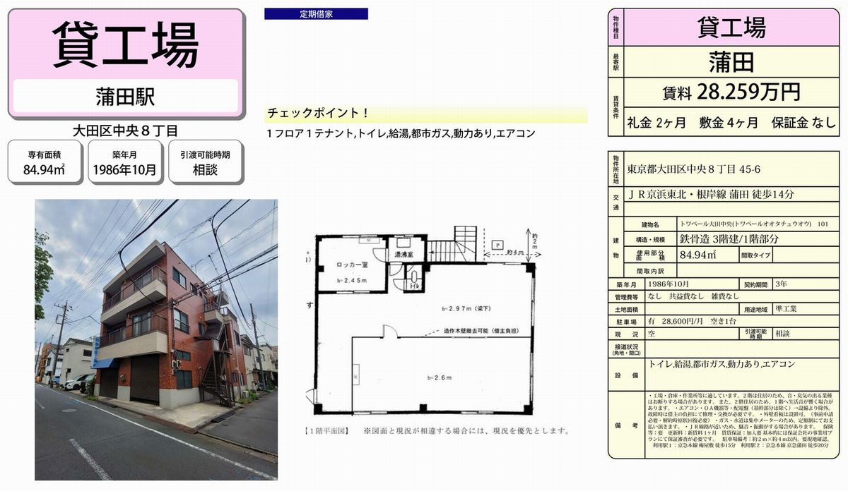 大田区中央8-45-6(東京都)の貸し倉庫・貸し工場をはじめ東京全域の貸し倉庫・貸し工場を検索できます。大田区中央8-45-6(東京都)の事務所付貸倉庫、クレーン付工場、店舗倉庫、工業専用地域等、ニーズに合わせて簡単検索。大田区中央8-45-6(東京都)の貸し倉庫・貸し工場を貸したい方にはオーナーサポートシステムで無料にて査定・掲載いたします。大田区中央8-45-6(東京都)で貸し倉庫・貸し工場をご契約のテナント様には貸し倉庫・貸し工場の設計変更、造作のご相談・施工も承ります。貸し倉庫・貸し工場で移転・新規開設をするなら東京地区最大級のテナント.com! |
