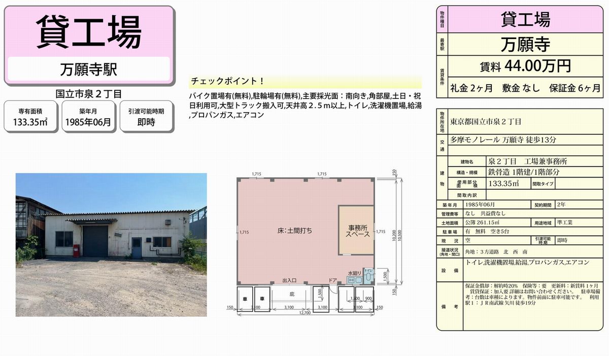 東京都国立市泉2-2-26 (万願寺) 万願寺 貸工場 詳細データ