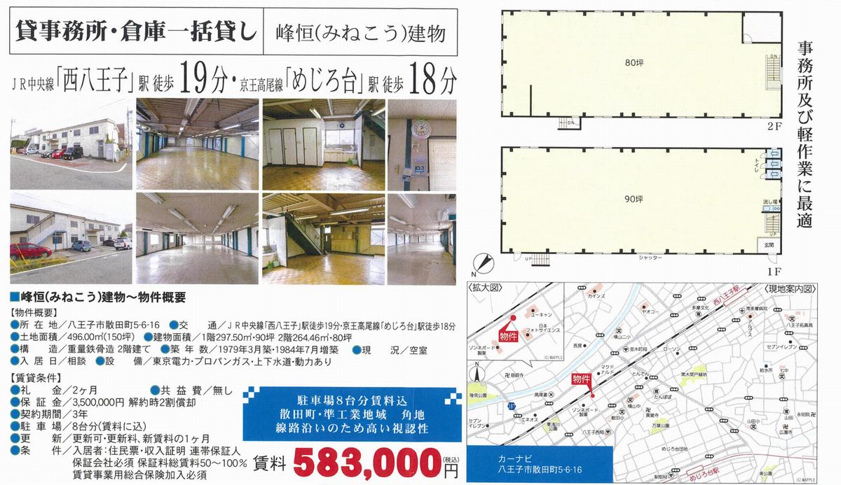 東京都内の貸し倉庫・貸し工場の情報満載(トップ) > 東京のエリアで探す > 東京都八王子市 > 西八王子 > 八王子市散田町5-6-16 峰恒建物