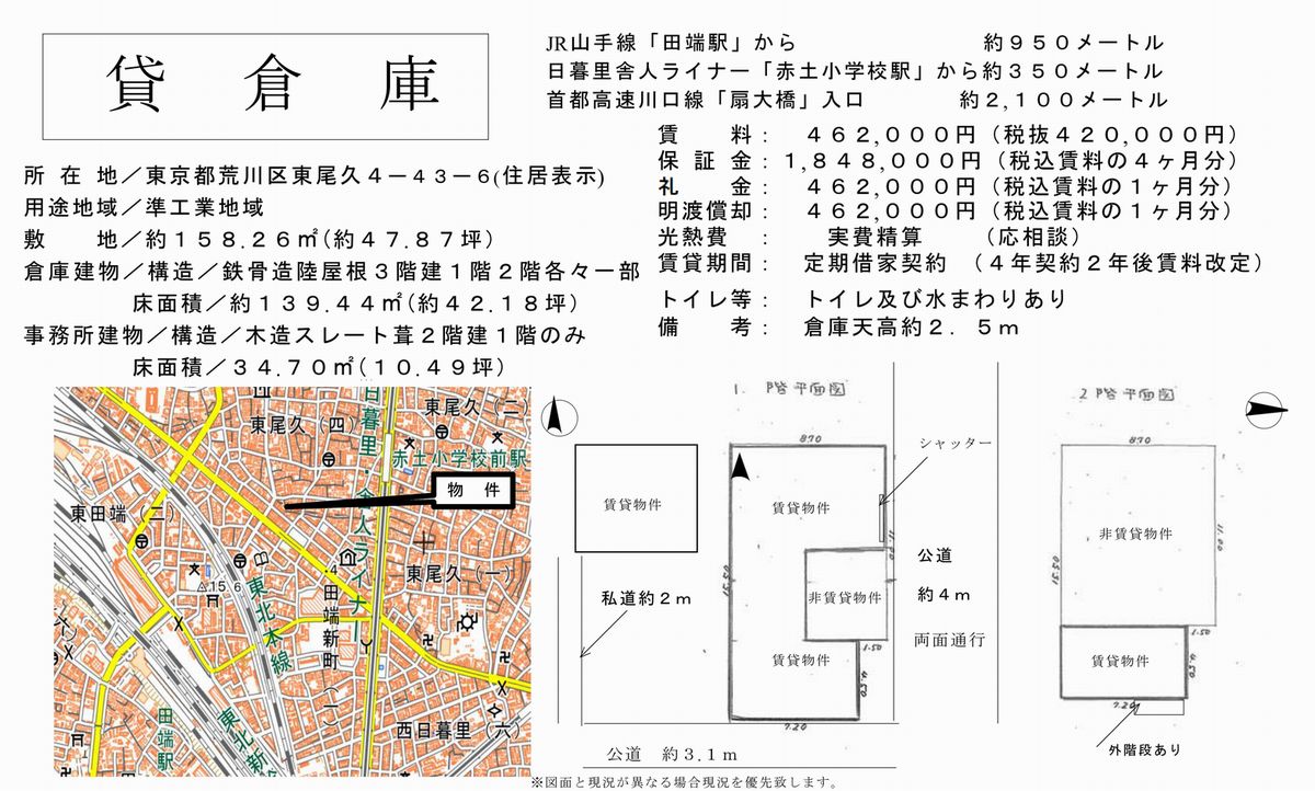 東京都荒川区東尾久4-43-6 (田端) 田端 貸倉庫 1-2F部分 詳細データ