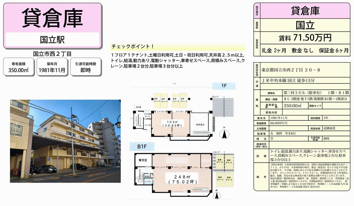 東京都内の貸し倉庫・貸し工場の情報満載(トップ) > 東京のエリアで探す > 東京都国立市 > 国立 > 国立市西2-20-8 第三村上ビル B1-1F部分