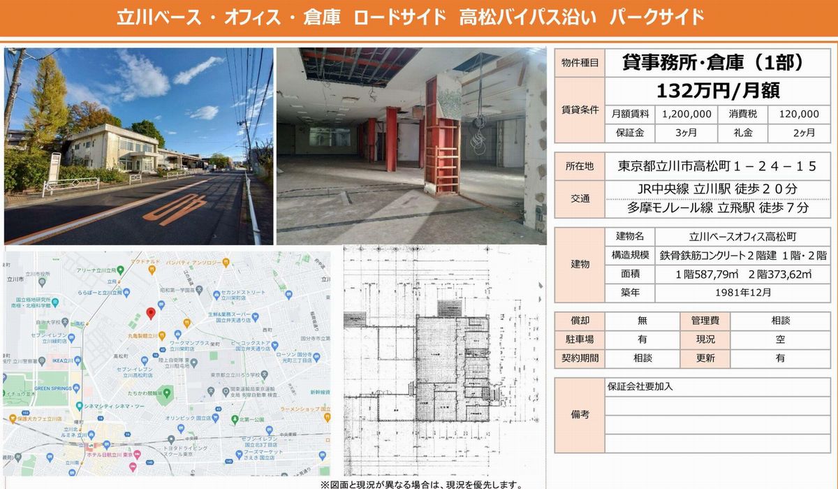立川市高松町1-24-15(東京都)の貸し倉庫・貸し工場をはじめ東京全域の貸し倉庫・貸し工場を検索できます。立川市高松町1-24-15(東京都)の事務所付貸倉庫、クレーン付工場、店舗倉庫、工業専用地域等、ニーズに合わせて簡単検索。立川市高松町1-24-15(東京都)の貸し倉庫・貸し工場を貸したい方にはオーナーサポートシステムで無料にて査定・掲載いたします。立川市高松町1-24-15(東京都)で貸し倉庫・貸し工場をご契約のテナント様には貸し倉庫・貸し工場の設計変更、造作のご相談・施工も承ります。貸し倉庫・貸し工場で移転・新規開設をするなら東京地区最大級のテナント.com! |