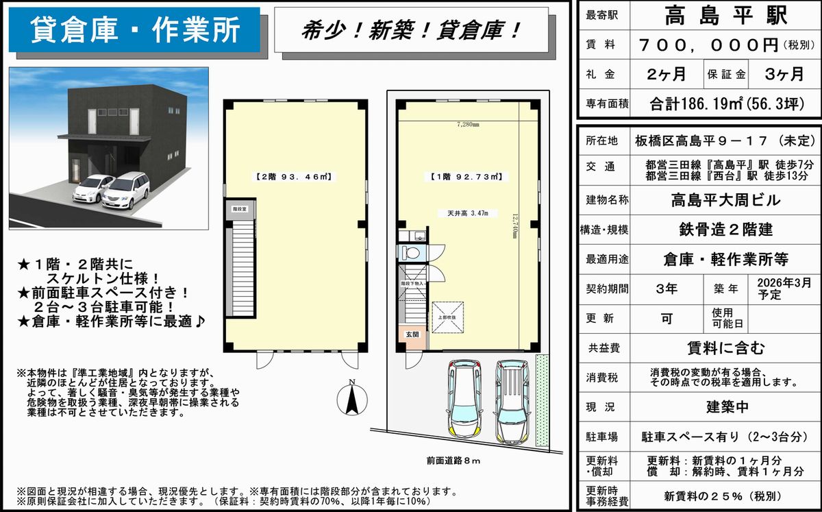 板橋区高島平9-17(東京都)の貸し倉庫・貸し工場をはじめ東京全域の貸し倉庫・貸し工場を検索できます。板橋区高島平9-17(東京都)の事務所付貸倉庫、クレーン付工場、店舗倉庫、工業専用地域等、ニーズに合わせて簡単検索。板橋区高島平9-17(東京都)の貸し倉庫・貸し工場を貸したい方にはオーナーサポートシステムで無料にて査定・掲載いたします。板橋区高島平9-17(東京都)で貸し倉庫・貸し工場をご契約のテナント様には貸し倉庫・貸し工場の設計変更、造作のご相談・施工も承ります。貸し倉庫・貸し工場で移転・新規開設をするなら東京地区最大級のテナント.com! |