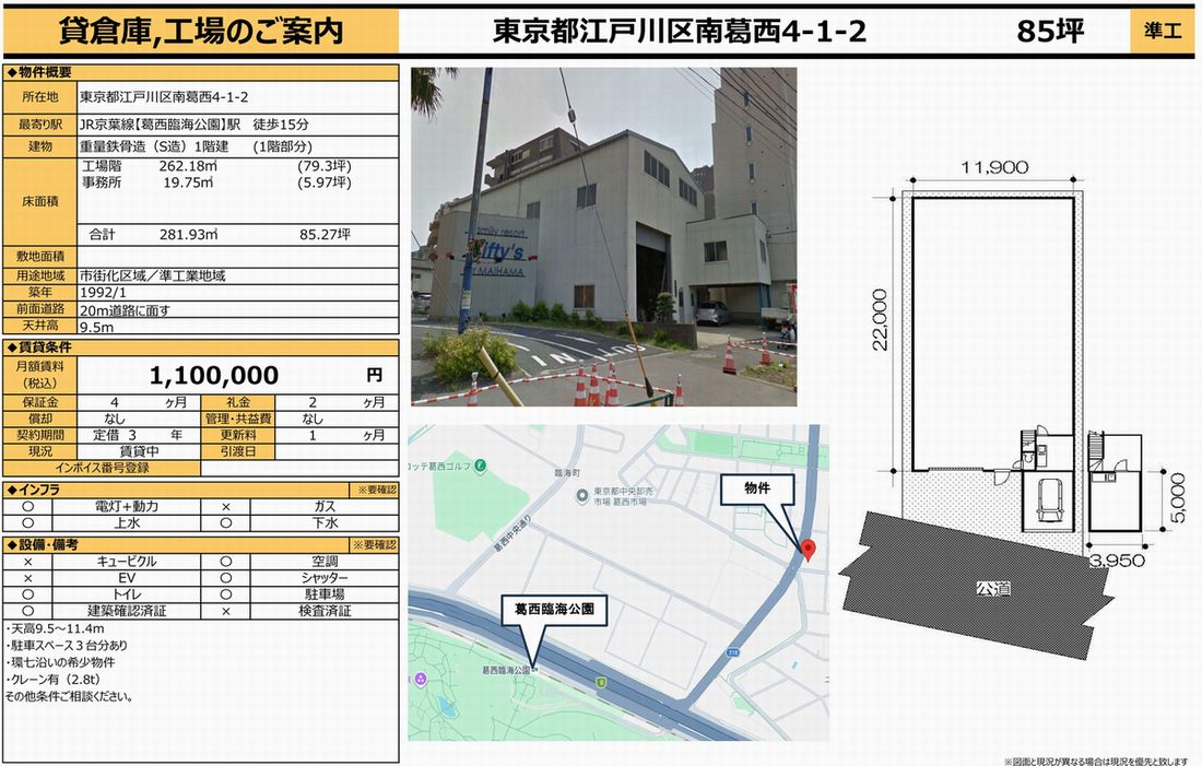 江戸川区南葛西4-1-2(東京都)の貸し倉庫・貸し工場をはじめ東京全域の貸し倉庫・貸し工場を検索できます。江戸川区南葛西4-1-2(東京都)の事務所付貸倉庫、クレーン付工場、店舗倉庫、工業専用地域等、ニーズに合わせて簡単検索。江戸川区南葛西4-1-2(東京都)の貸し倉庫・貸し工場を貸したい方にはオーナーサポートシステムで無料にて査定・掲載いたします。江戸川区南葛西4-1-2(東京都)で貸し倉庫・貸し工場をご契約のテナント様には貸し倉庫・貸し工場の設計変更、造作のご相談・施工も承ります。貸し倉庫・貸し工場で移転・新規開設をするなら東京地区最大級のテナント.com! |