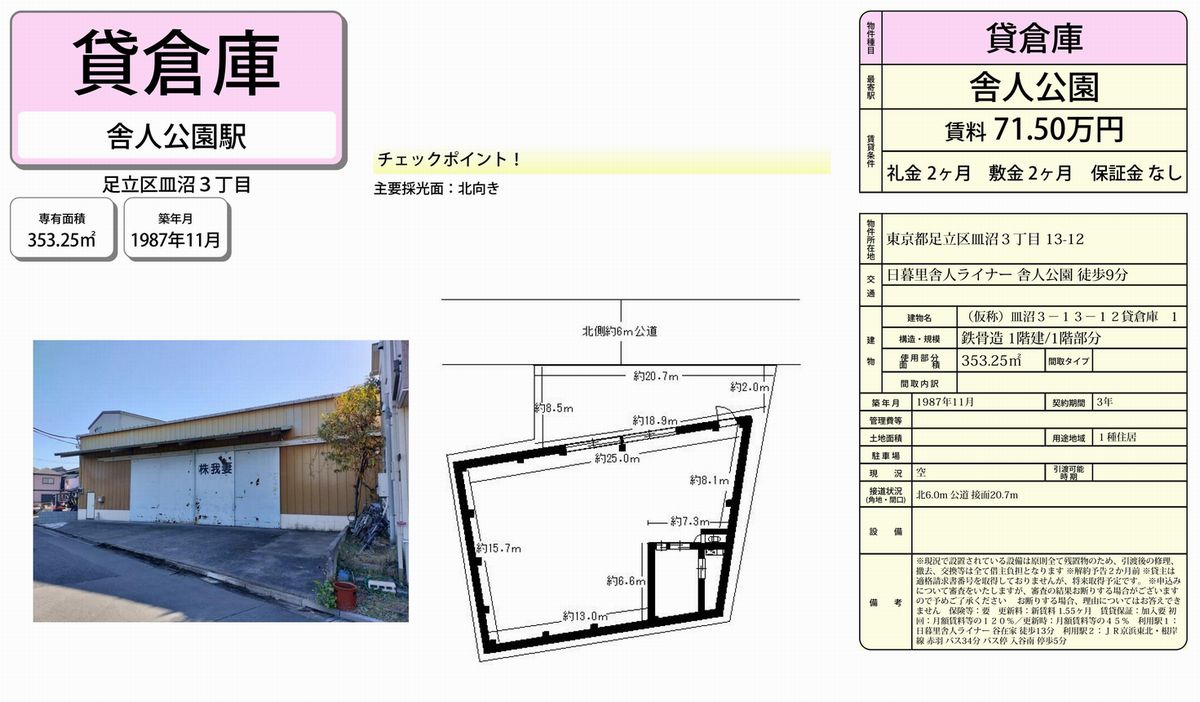 東京都足立区皿沼3-13-12 (舎人公園) 舎人公園 貸倉庫 詳細データ