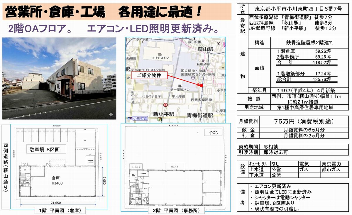 東京都小平市小川東町4-6-7 (新小平) 新小平 倉庫事務所 詳細データ