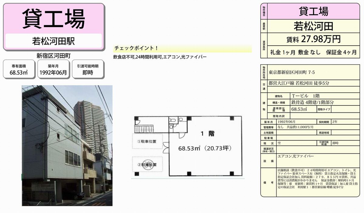 東京都内の貸し倉庫・貸し工場の情報満載(トップ) > 東京のエリアで探す > 東京都新宿区 > 若松河田 > 新宿区河田町7-5 Tビル