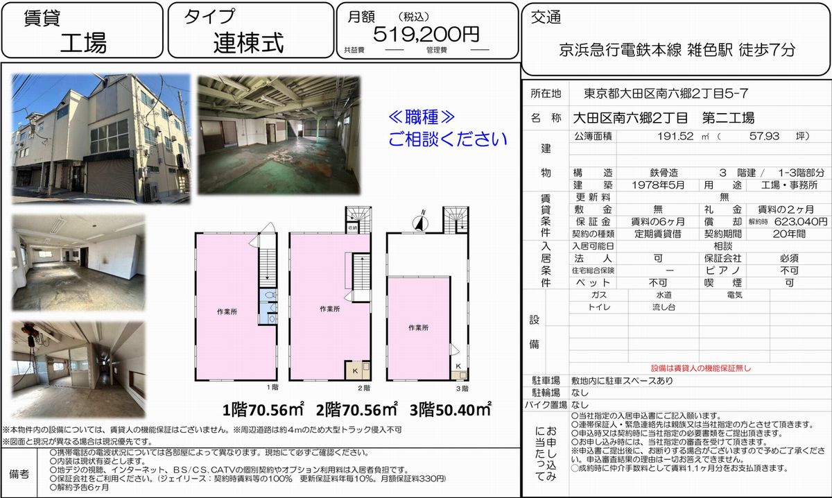 大田区南六郷2-5-7(東京都)の貸し倉庫・貸し工場をはじめ東京全域の貸し倉庫・貸し工場を検索できます。大田区南六郷2-5-7(東京都)の事務所付貸倉庫、クレーン付工場、店舗倉庫、工業専用地域等、ニーズに合わせて簡単検索。大田区南六郷2-5-7(東京都)の貸し倉庫・貸し工場を貸したい方にはオーナーサポートシステムで無料にて査定・掲載いたします。大田区南六郷2-5-7(東京都)で貸し倉庫・貸し工場をご契約のテナント様には貸し倉庫・貸し工場の設計変更、造作のご相談・施工も承ります。貸し倉庫・貸し工場で移転・新規開設をするなら東京地区最大級のテナント.com! |