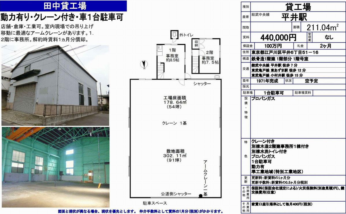 東京都江戸川区平井6-51-16 (平井) 田中貸工場 詳細データ