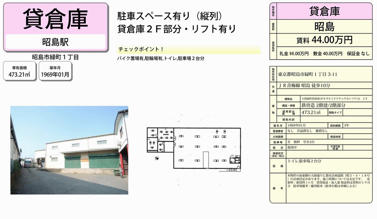 昭島市緑町1-3-11(東京都)の貸し倉庫・貸し工場をはじめ東京全域の貸し倉庫・貸し工場を検索できます。昭島市緑町1-3-11(東京都)の事務所付貸倉庫、クレーン付工場、店舗倉庫、工業専用地域等、ニーズに合わせて簡単検索。昭島市緑町1-3-11(東京都)の貸し倉庫・貸し工場を貸したい方にはオーナーサポートシステムで無料にて査定・掲載いたします。昭島市緑町1-3-11(東京都)で貸し倉庫・貸し工場をご契約のテナント様には貸し倉庫・貸し工場の設計変更、造作のご相談・施工も承ります。貸し倉庫・貸し工場で移転・新規開設をするなら東京地区最大級のテナント.com! |