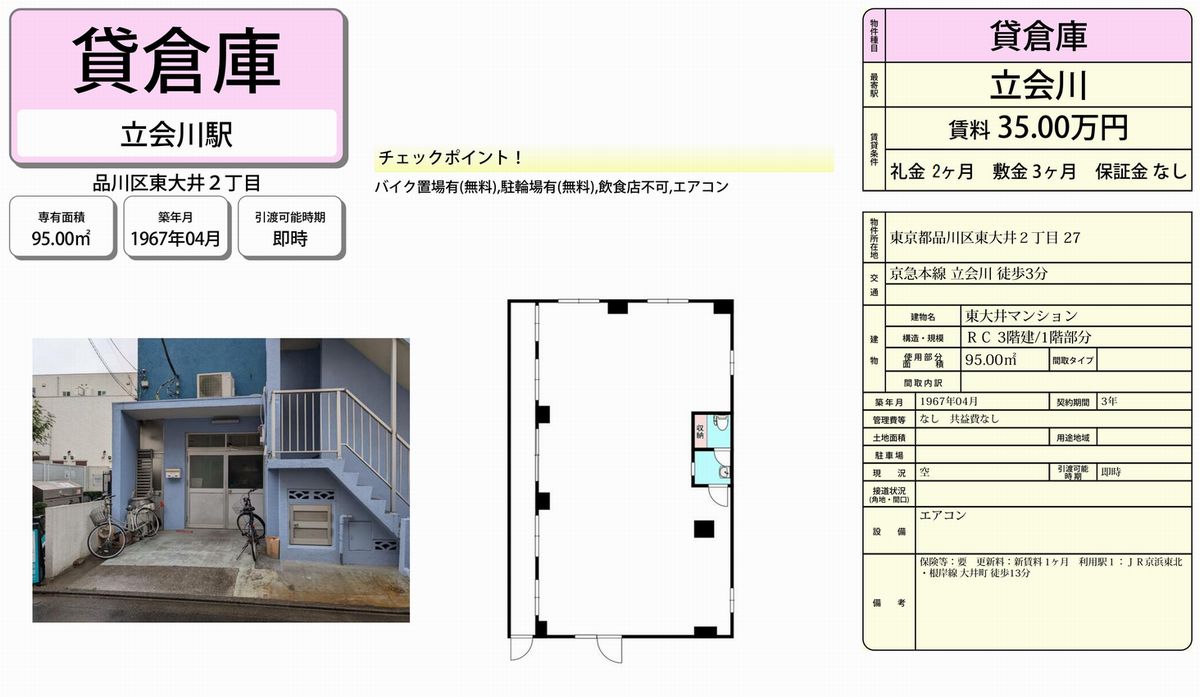 東京都内の貸し倉庫・貸し工場の情報満載(トップ) > 東京のエリアで探す > 東京都品川区 > 立会川 > 品川区東大井2-27 東大井マンション